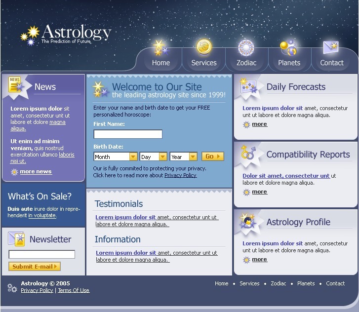 Astrology MotoCMS Website Design #218784 - TemplateMonster This astrology website design is perfect for various astrology agencies. Mainly, you can use it for providing information about an online astrology conference and its speakers. People can examine the schedule and book tickets for the event directly on the website. The template also lets your customers get a daily horoscope for their sign.