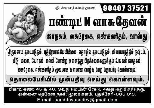 Welcome to Omsrikrishna.com Welcome to Omsrikrishna.com ஓம் ஸ்ரீ கிருஷ்ணா ஜோதிட நிலையம் உங்களை அன்புடன் வரவேற்கிறது இங்கு ஜாதகம், பிரசன்னம், ஆருடம், எண் கணிதம், வாஸ்து சாஸ்திரம், திருமண பொருத்தம் பார்க்கப்படும். திருக்கணிதம் மற்றும் வாக்கிய கணித முறைப்படி வாழ்நாள் முழுவதற்கும் உண்டான பலாபலன்களுடன் ஜாதகம் கணித்து எழுதித்தரப்படும்.