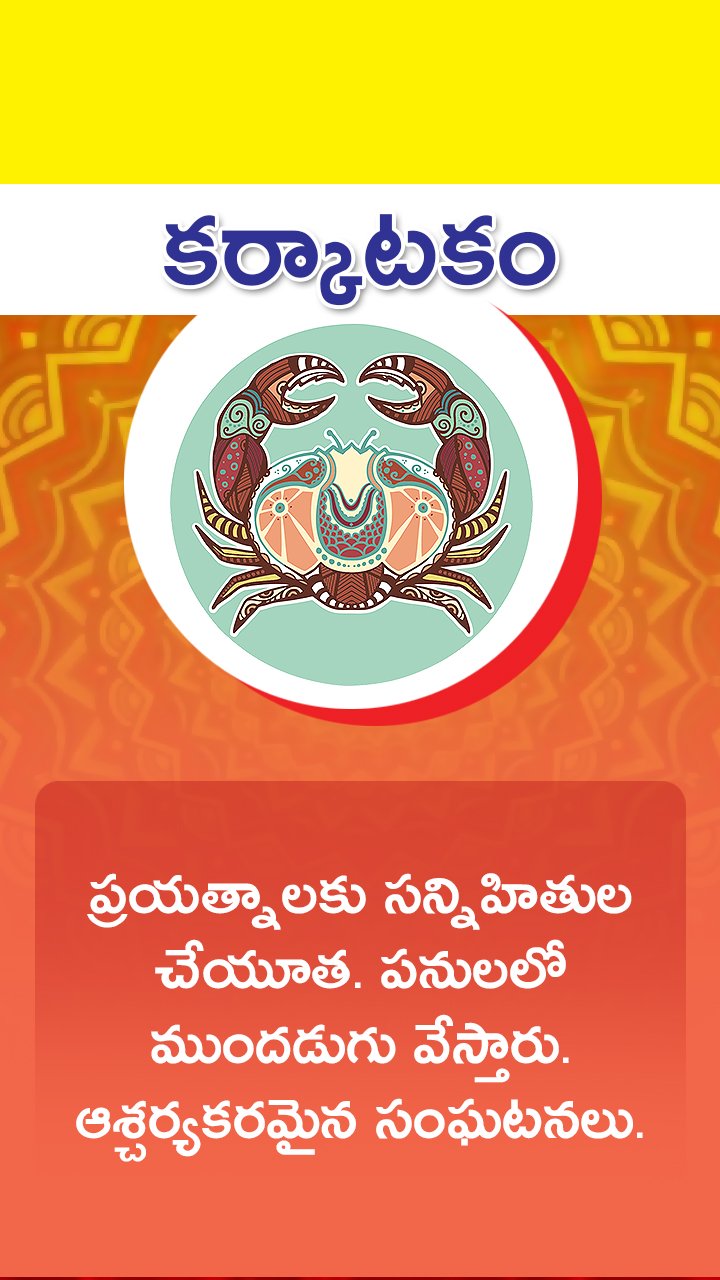 Daily astrology in telugu. Free Telugu Horoscope (తెలుగు జాతకం), Telugu Astrology - Clickastro Telugu Astrology the tool to making future brilliant and joyful Contains 36 36-year Predictions Remedies 60 60+ Pages What we need: Your birth details What you get: 100% Free Preview and summary Complete comprehensive In-depth horoscope Trusted By Over 50,000 professional astrologers Based on 90+ Vedic scripts with over 300,000 hours of research daily horoscope in telugu, Horoscope Today Dec 11th ఈరోజు ఓ రాశి ... మేష రాశి ఫలితాలు (Aries Horoscope Today) ఈ రాశి వారికి ఈరోజు బయటి వ్యక్తుల పరిచయాల వల్ల ప్రయోజనకరంగా ఉంటుంది. కుటుంబం, స్నేహితులతో మంచి సమయం గడుపుతారు. ఈరోజు స్నేహితుల కోసం కొంత డబ్బును ఖర్చు చేయొచ్చు. స్థిరాస్తులకు సంబంధించిన వ్యవహారాలు కొంత ఇబ్బందిగా ఉంటాయి. మీకు నష్టం కూడా జరగొచ్చు. ఏదైనా ముఖ్యమైన నిర్ణయం తీసుకునే ముందు తీవ్రంగా ఆలోచించాలి. In-Depth Horoscope in Telugu from Clickastro.com Astrological Analysis of Johnny Depp's and Amber Heard's Horoscopes. Horoscope of Johnny Depp Johnny Depp was born on Sunday, 9th June 1963, in Owensboro, Kentucky, United States. Depp's birth Star is Purvashada 1st Pada and birth Rashi is Dhanu with Guru or Jupiter as Lord. రోజువారీ కర్కాటక రాశి జాతక ఫలితాలు, Daily karkataka Rashi Phalalu in ... కర్కాటక రాశి ఫలాలు (Wednesday, December 14, 2022) మీ ప్రేమ తిరస్కరించబడుతుంది. మీ ఖర్చులను అదుపు చెయ్యండి. ఈ రోజు ఖర్చులలో మరీ విలాసాలకు ఎక్కువ ఖర్చుఅయిపోకుండా చూసుకొండి. ఒక సాయంత్రం వేళ, ఒక పాత స్నేహితుడు ఫోన్లో పలకరించి, అద్భుతమైన జ్ఞాపకాలను తీసుకుని రావచ్చును. ఈ రోజు, అకస్మాత్తుగా రొమాంటిక్ ఎన్ కౌంటర్ ఎదురుకావచ్చును.